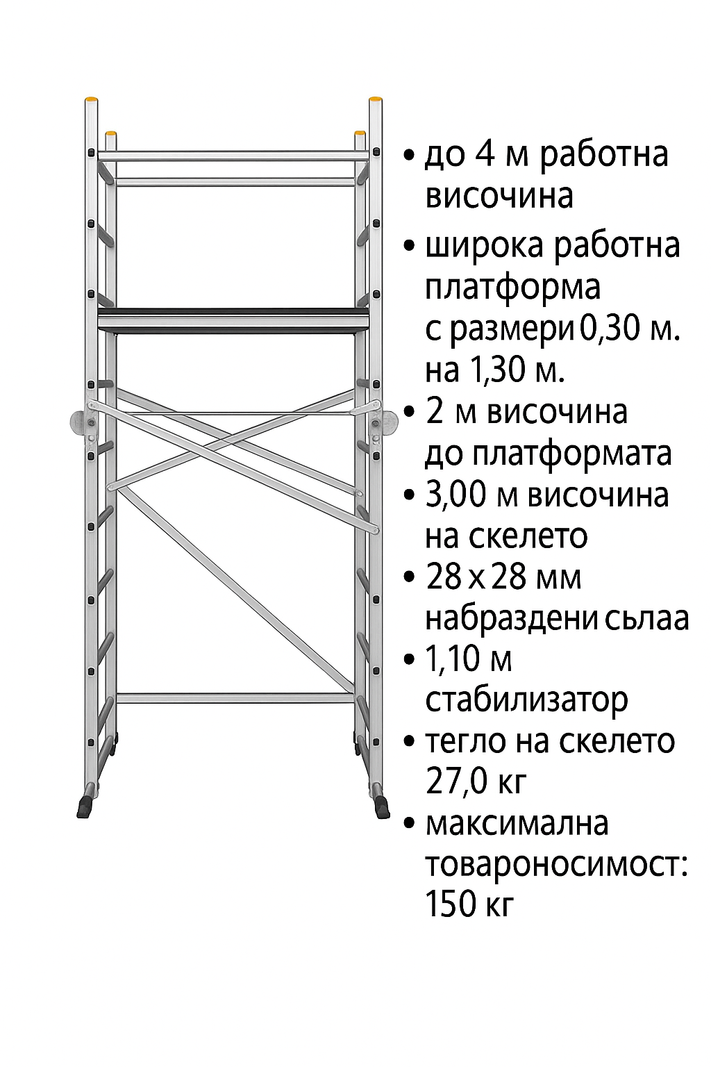 - до 4 м. работна височина - максималната височина, която може да достигне човек стъпил върху платформата на скелето
