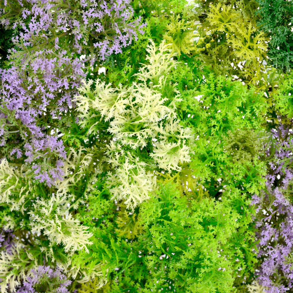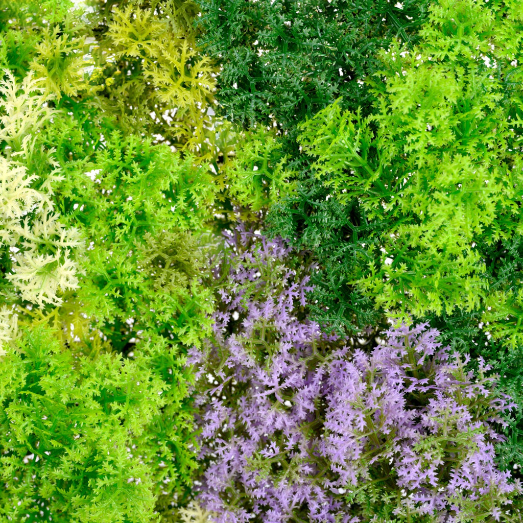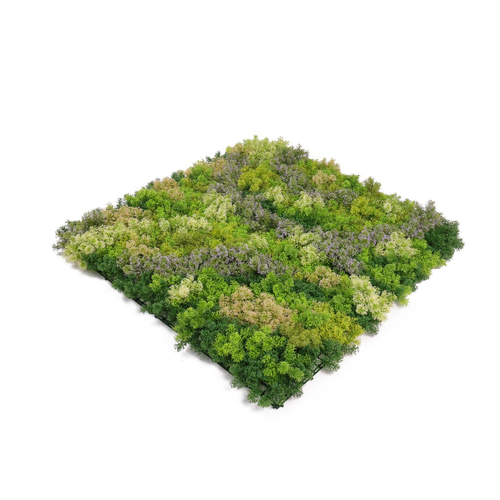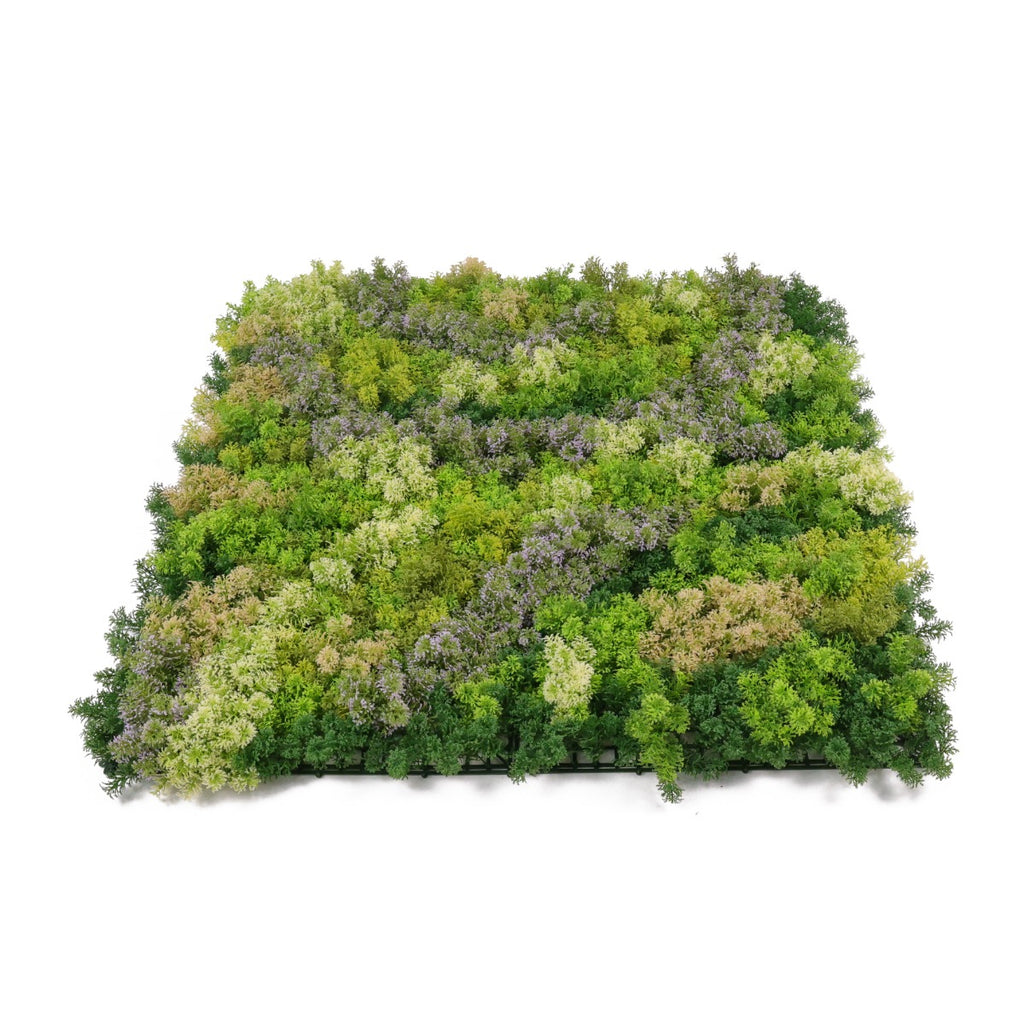 Луксозната декоративна плочка покрива 1 m² площ и съдържа гъсто разположени клончета от различни цветове скандинавски мъх с акцент лилаво.