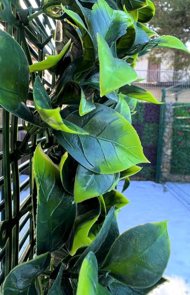 Декоративните плочки от гардения са произведени от полипропилен, красиви са и не изискват поддръжка. Листата са тъмнозелени и блестящи, разположени плътно на снопчета по 4-5 броя. Цветът в края на някои листенца е по-светъл, което придава реалистична визия. Може лесно да изрязвате декоративните плочки с ножиците, които имате у дома и да ги оформяте спрямо нуждите си. Закрепват се за огради и парапети с помощта на кабелни връзки или тел за привързване, като придават свеж изглед на околното пространство. Използвайте декоративните плочки и като акцент в интериора.