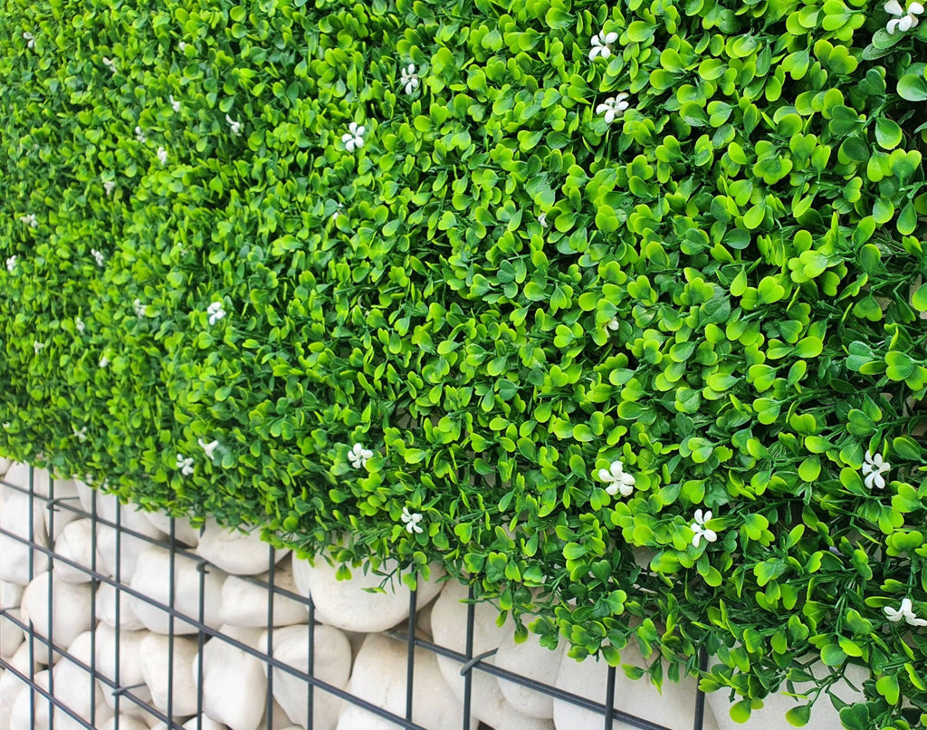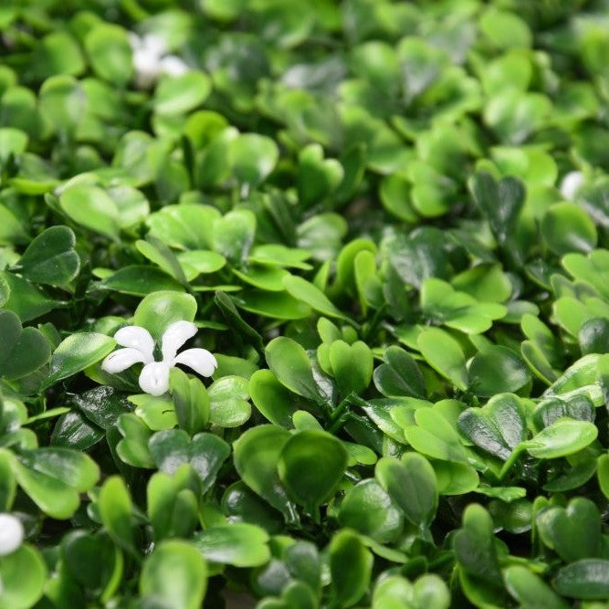 Декоративните плочки Жасмин са произведени от висококачествен полиетилен по модерна технология, която прави листата здрави и в същото време приятни на допир. Те са сърцевидни, яркозелени и гъсто разположени, а цветчетата са бели. Имат чиста линия, без несъвършенства на материала. Плочките са с UV защита, не избледняват при употреба на открито и запазват свежите си цветове дълго време. Може лесно да ги изрязвате с ножиците, които имате у дома и да ги оформяте спрямо нуждите си. Закрепват се за огради и парапети с помощта на кабелни връзки или тел за привързване, като придават свеж изглед на околното пространство и създават визуална бариера. Използвайте декоративните плочки и като акцент в интериора.