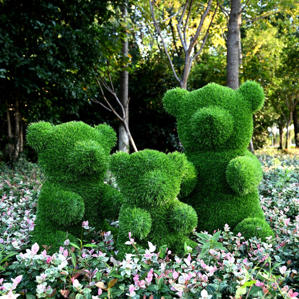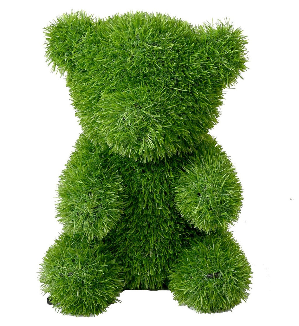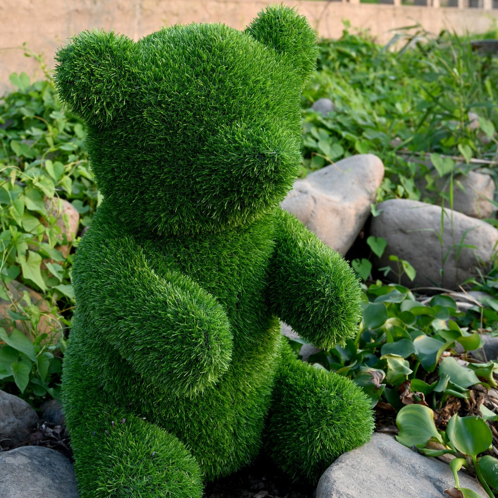 Произведена е от изкуствена трева и имитира свежи тревни стръкове. Фигурата е устойчива на атмосферни влияния, не избледнява лесно и запазва формата си през всички сезони. Лесна е за поддръжка и може да се постави както на закрито, така и на открито. Със своя уникален дизайн и наситен зелен цвят, мечето привлича вниманието и се превръща в любим елемент от всяко пространство – както за деца, така и за възрастни.