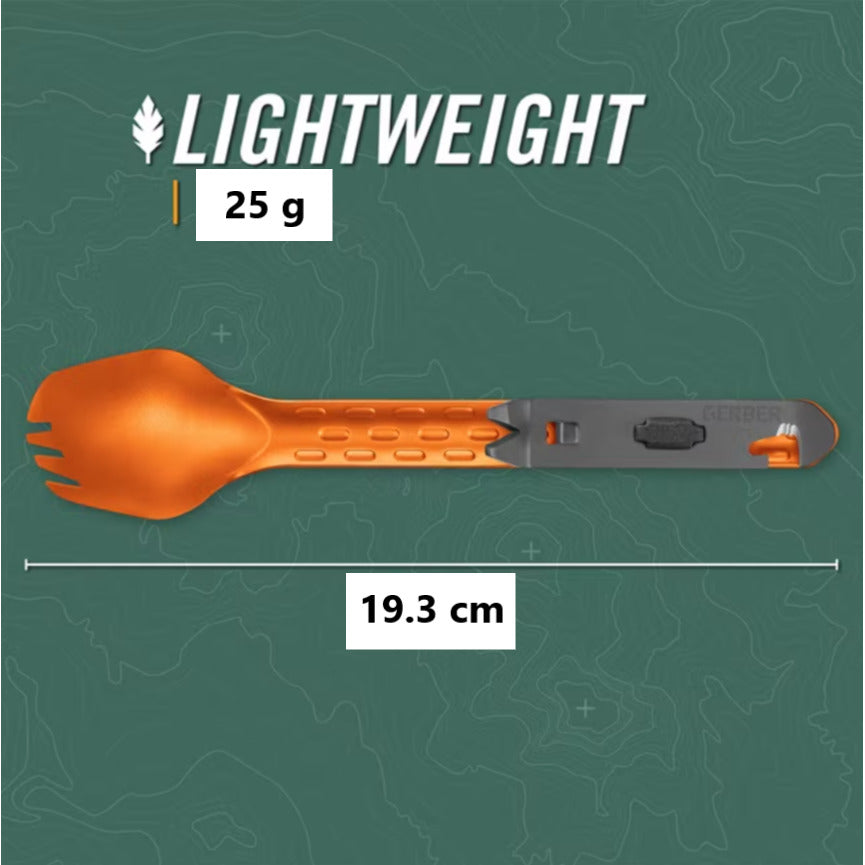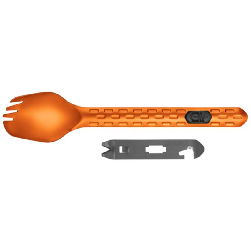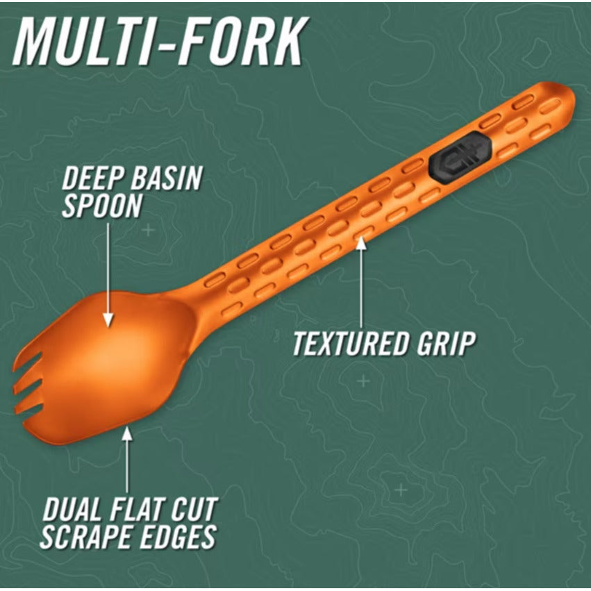 Алуминиевата вилица за къмпинг ComplEAT на Gerber се предлага с мултифункционален инструмент с 6 функции, който се монтира на гърба ѝ.