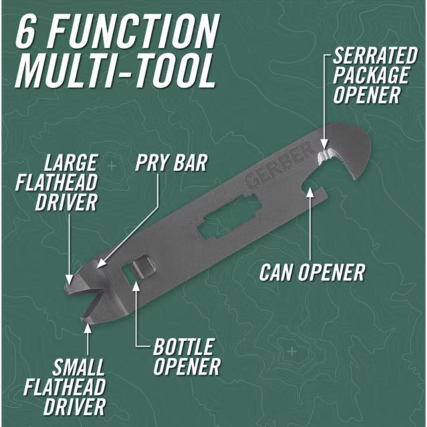 • Съдържа вилица и лъжица с оребрена дръжка, шпатула за остъргване и инструмент с шест функции - отварачка за бутилки, отварачка за консерви, отварачка за кутии и пакети, малка отвертка с плоска глава, голяма отвертка с плоска глава, щанца за изтръгване