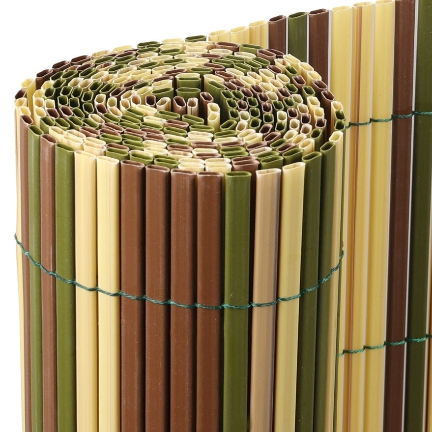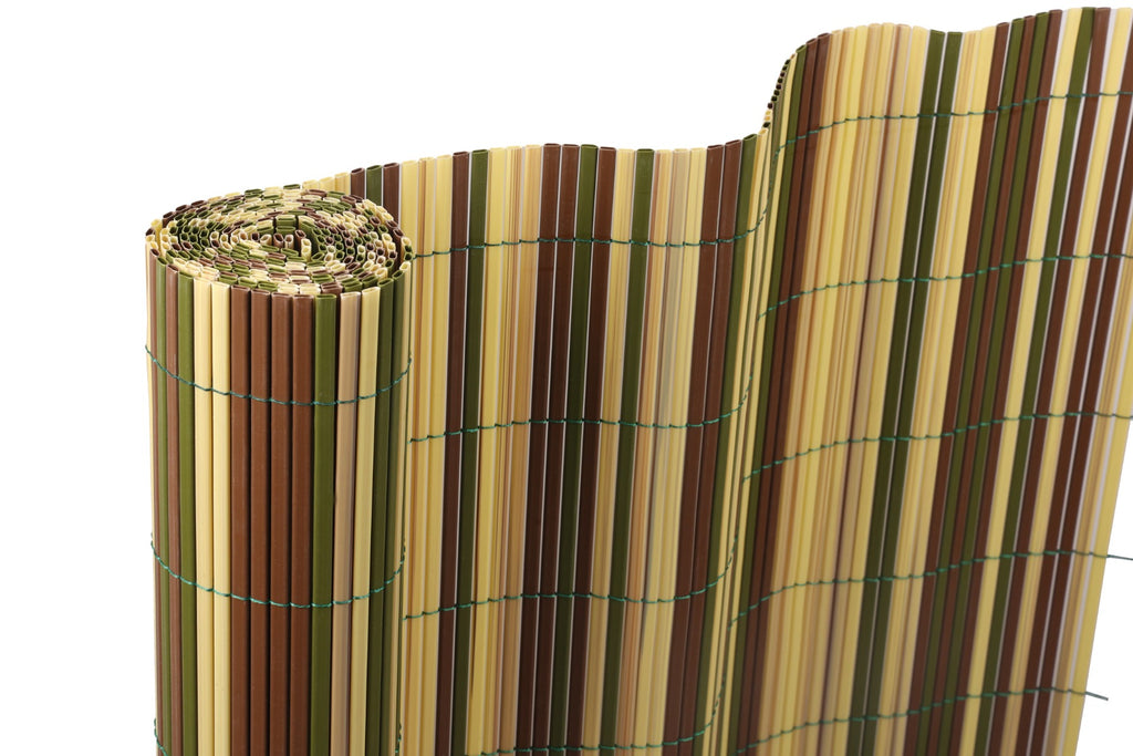 Покривалото е направено от двойни PVC ламели с реалистична визия на бамбукови пръчки в различни нюанси на натуралното, зеленото и кафявото.