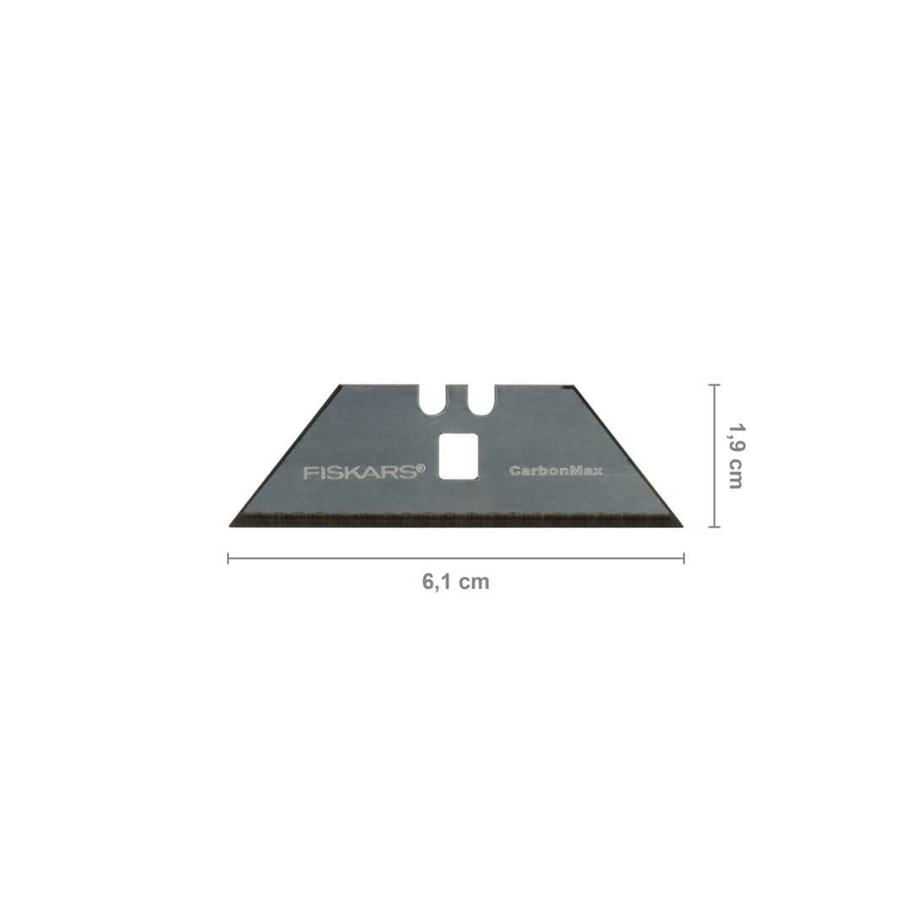 Остриетата CarbonMax™ разполагат със собствено покритие на Fiskars, което увеличава здравината и поддържа остротата до 24 пъти по-дълго от стандартните остриета. Остриетата са обстойно лабораторно тествани и проверени. Опаковката включва 5 броя остриета. Подходящи са и за макетни ножове, които не са Fiskars.