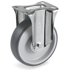 СЕРИЯ 71:Колела с център от сив полипропилен и сива термопластична гума, твърдост 85 Shore A.Предназначени за колички с леки товари, предимно за вътрешна употреба; сивата гума без следи ги прави подходящи за използване върху чупливи подове, а също и в домашна/институционална среда. Отлично съпротивление при търкаляне.